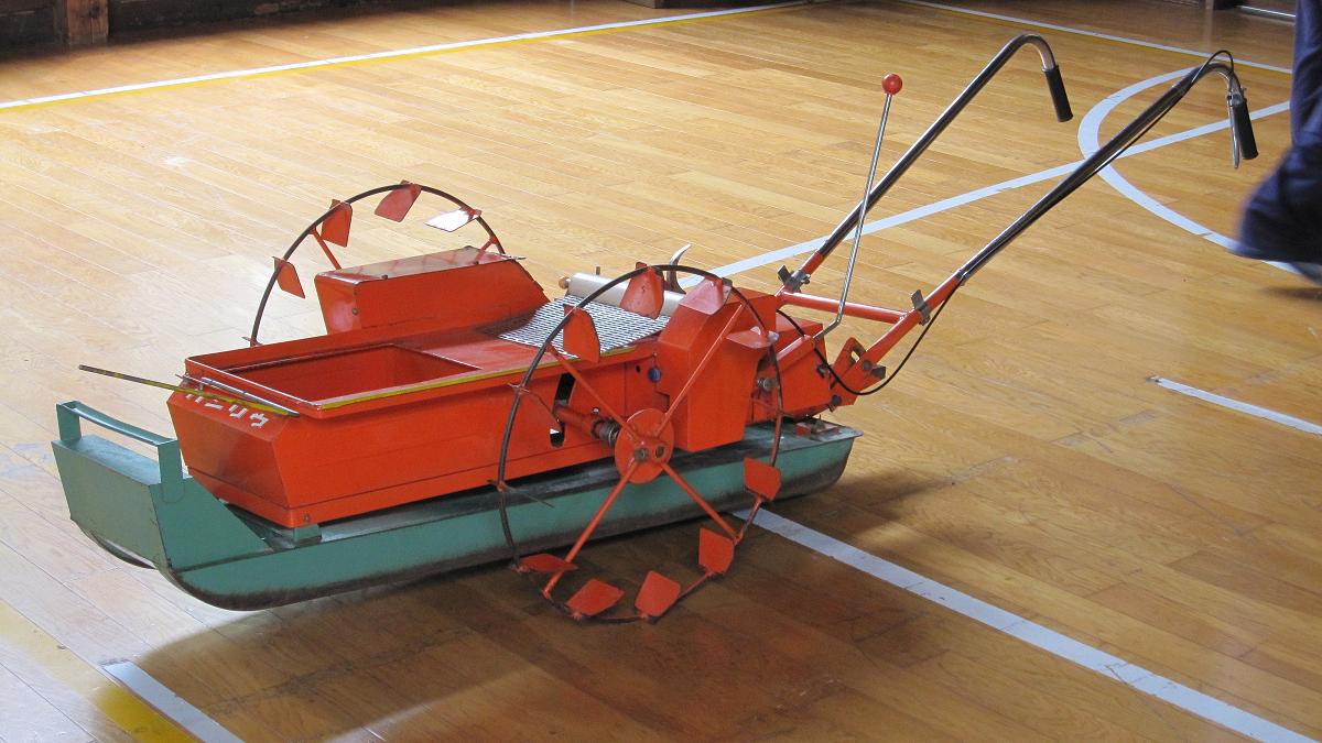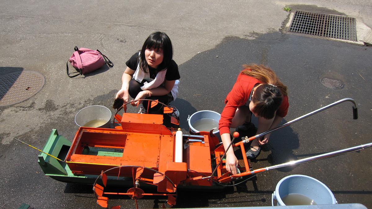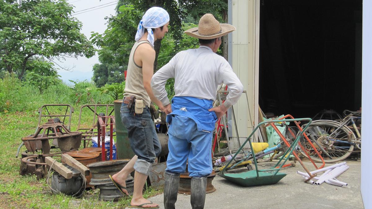 初期のころの耕運機を集落の方から頂いてきました。吉野教授いわく、「このプランに使われるためにずっと物置の中で待ってた」耕運機!スタッフの手で奇麗に洗われました!