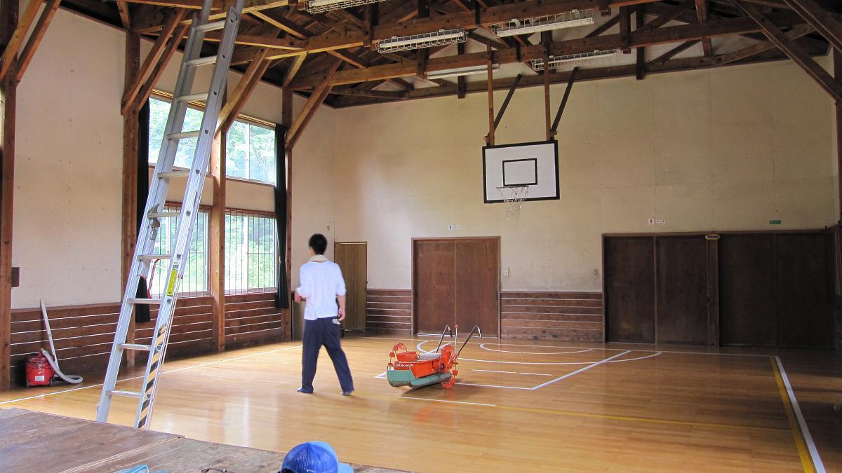 体育館全景。どの位の広さか、どの位置に置くか、メジャーで計って決めていきます。