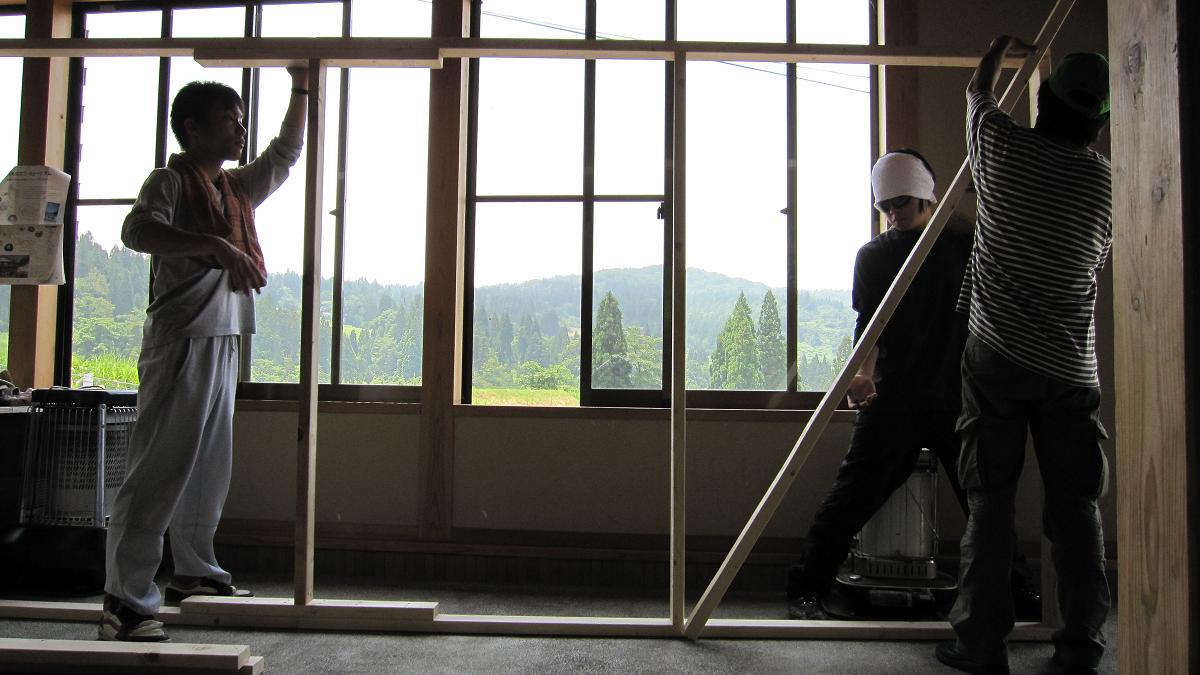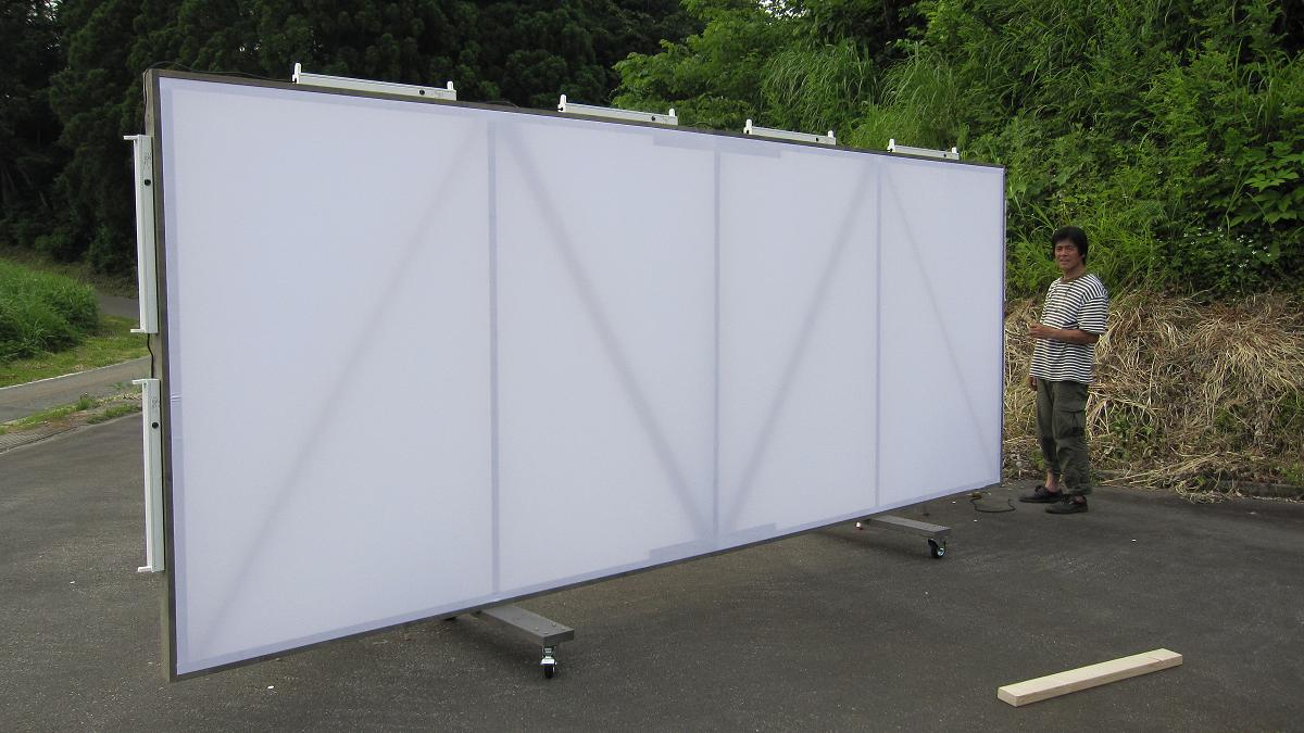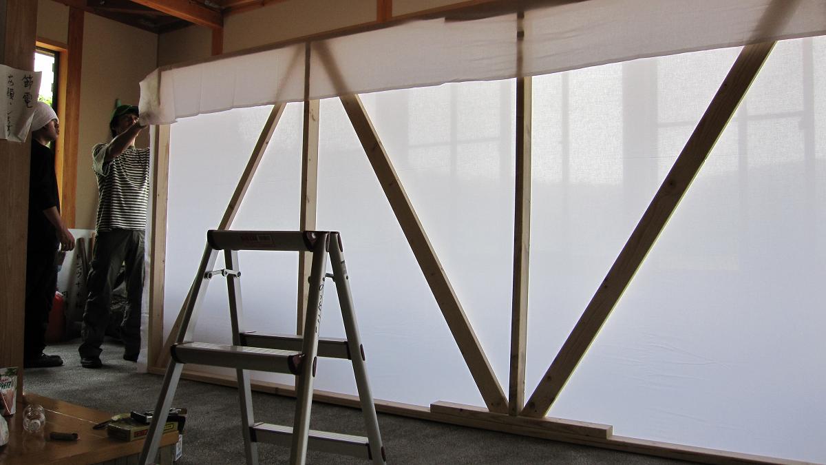 角材を切って骨組みを組立て、白い布をガンタッカーという大きなホッチキスの様なもので止めていきます。