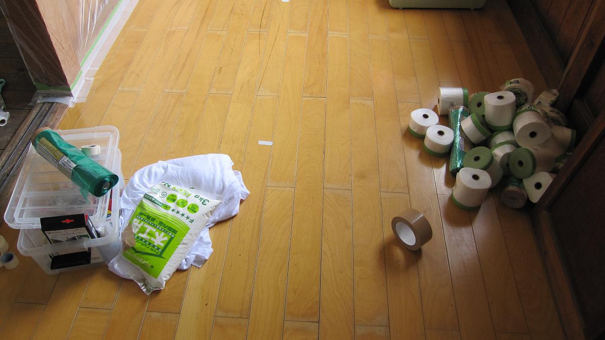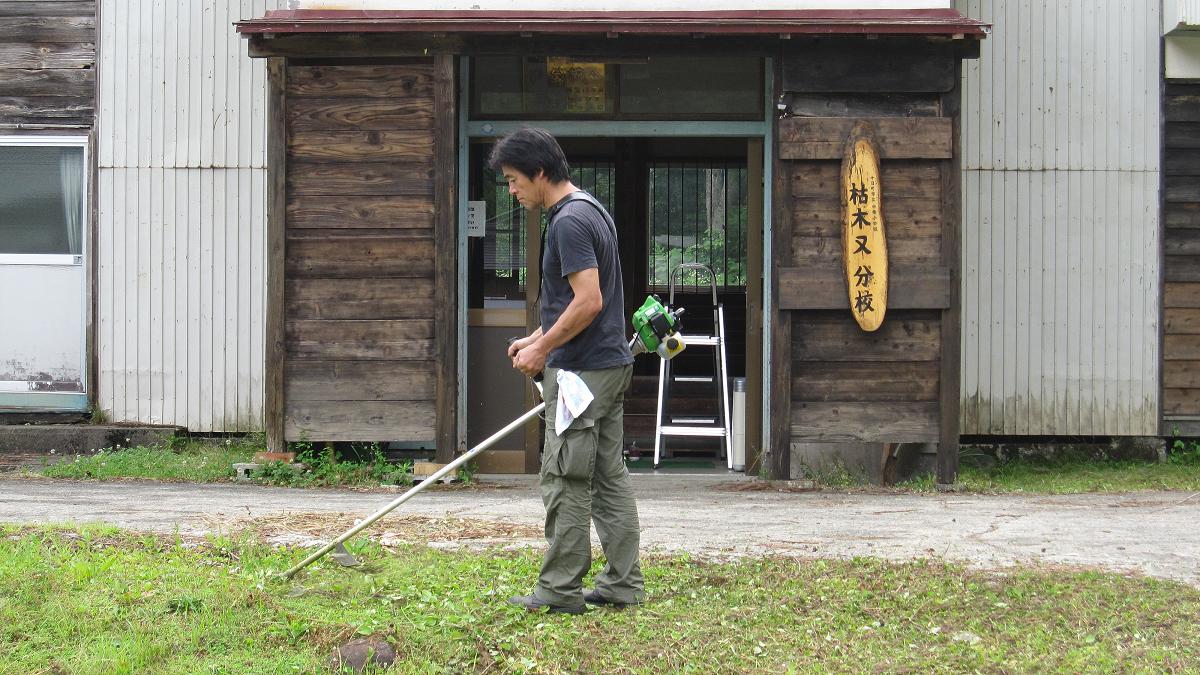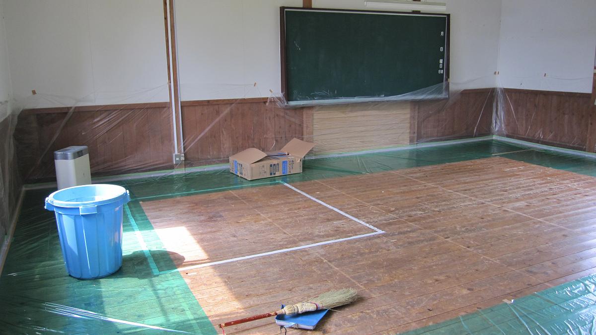笠原さんは、ほかのアーカイブメンバーとともに私たちより一週間前の19日から21日に枯木又へ来て制作をしていました。その時教室内の家具を廊下へ運び出し、床をワックスがけしています。