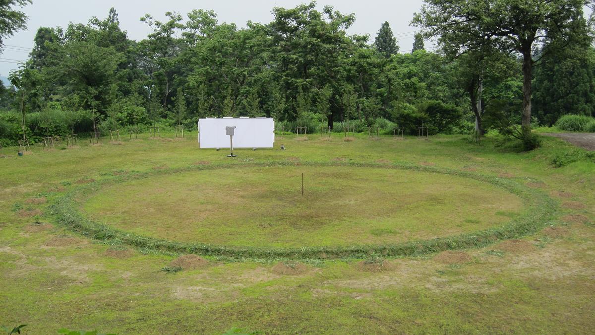 前回の現地制作から、約1か月2週間が経ち、以前は茶色い土だった彼岸花の土手もクヌギの植え込みも雑草がたくさん生えていました!生えていないんじゃないかと心配だった内田教授ですが、生えすぎでした。
