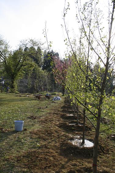 こちらは校庭の端のほうに列で植えられるトリネコやハンノキの若木。