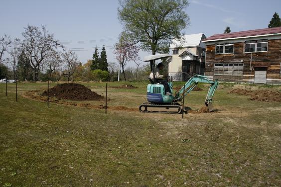 おなじ立体造形の西教授がシャベルカーで(喋りながら)穴を掘り、そこに植えていきました。